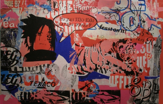 Aérosol, pochoirs, collage 96 x 146 cm.
